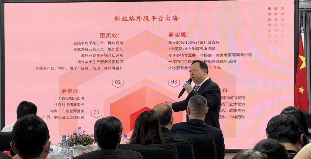 张世松先生通过视频展示了2024年新丝路外服组织企业出海的总结回顾,他解释了新丝路外服平台在2025年如何更专业、更实效、更实惠、更全面的为企业提供跨境展销一体化服务,帮助企业由点到面的拓展海外区域市场。