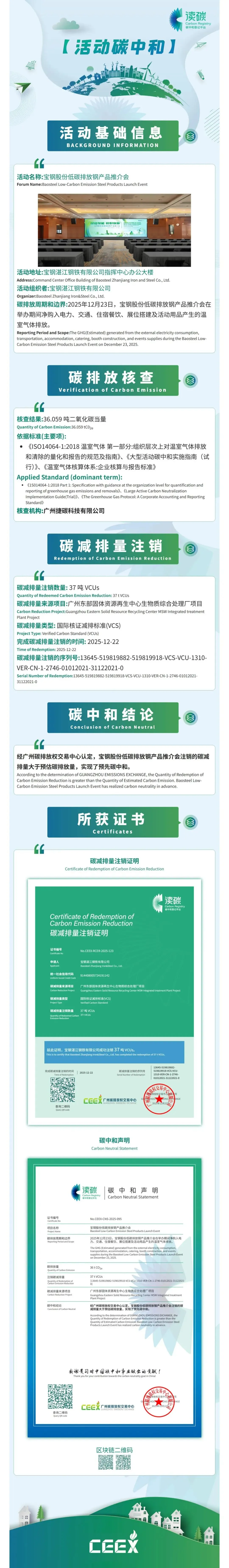 宝钢股份低碳排放钢产品推介会完成2025年12月23日碳盘查,碳排放量为36.059吨二氧化碳当量,完成注销碳减排量37吨。经广州碳排放权交易中心认定,宝钢股份低碳排放钢产品推介会注销的碳减排量大于预估碳排放量,实现了预先碳中和。