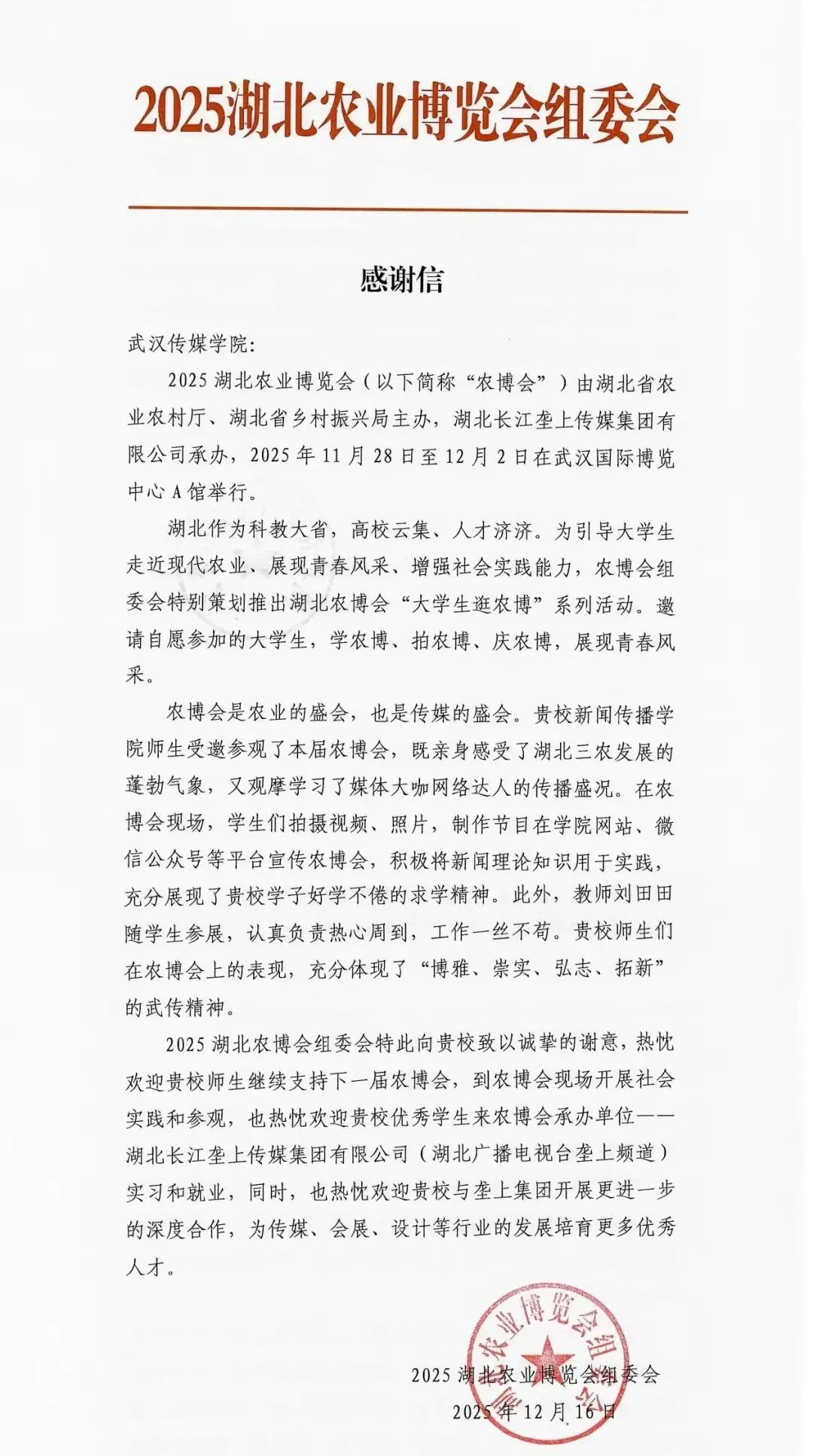 农博会组委会在感谢信中,对武传师生的表现予以高度评价,不仅诚挚致谢,更邀请师生继续参与下一届农博会,欢迎优秀学子到承办单位湖北长江垄上传媒集团实习就业,期待双方深化合作,为传媒、会展行业培育更多人才。