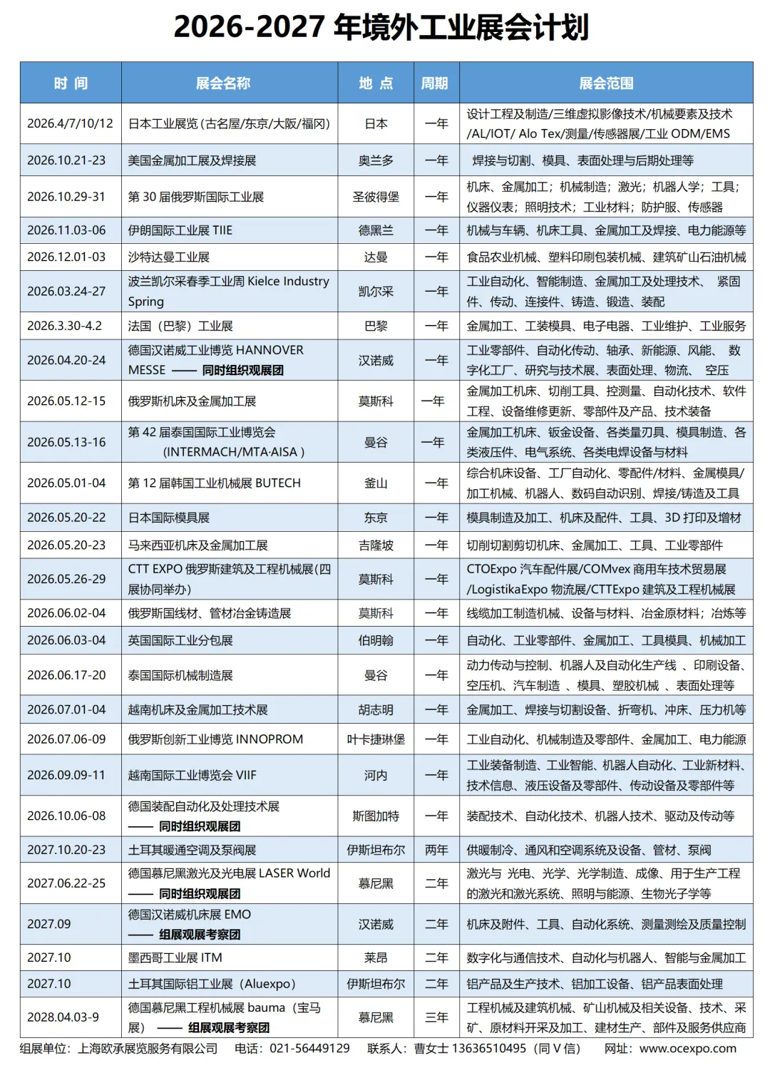 2026年,上海欧承展览将继续组团前往“HANNOVER MESSE德国汉诺威工业博览会”,我司申请了国际区靠中心位置的展位,展位面积有限,有需要国际区展位的新老客户,请尽快咨询我司销售人员。同时,观展考察团已开始报名,展后有欧洲知名工厂考察+多条游览线路供您选择!欢迎各位参展商及观展商踊跃报名参加!