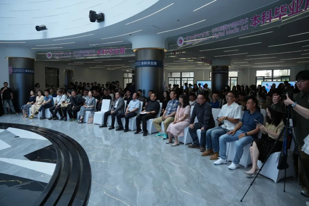 设计学院院长万凡教授发表致辞,他对出席活动的领导嘉宾、兄弟院校的同仁、企业代表表示欢迎和感谢,对指导和参与本次展览的师生表示祝贺。他指出,本次毕业设计展以数智美学、生态设计及民族文化传播为核心主题,展现了同学们在数智时代下的艺术探索与设计实践。在当今时代,AI已超越工具属性,成为创作者表达思想、扩展想象的新维度。通过展品,我们既能看到算法逻辑与美学法则的辩证统一,也见证了人机协同创作的艺术可能性,更感受到了技术与人文的深度交融。作为立足前沿的特色专业,数字媒体艺术教育始终强调设计价值的实践转化。本次毕业设计展不仅是展示数媒系师生成果的平台,更是引导师生思考在智能时代背景下数媒专业如何发展的媒介。期待数媒师生以创新思维突破技术边界,用批判意识审视创作本质,以开放胸襟拥抱行业变革!