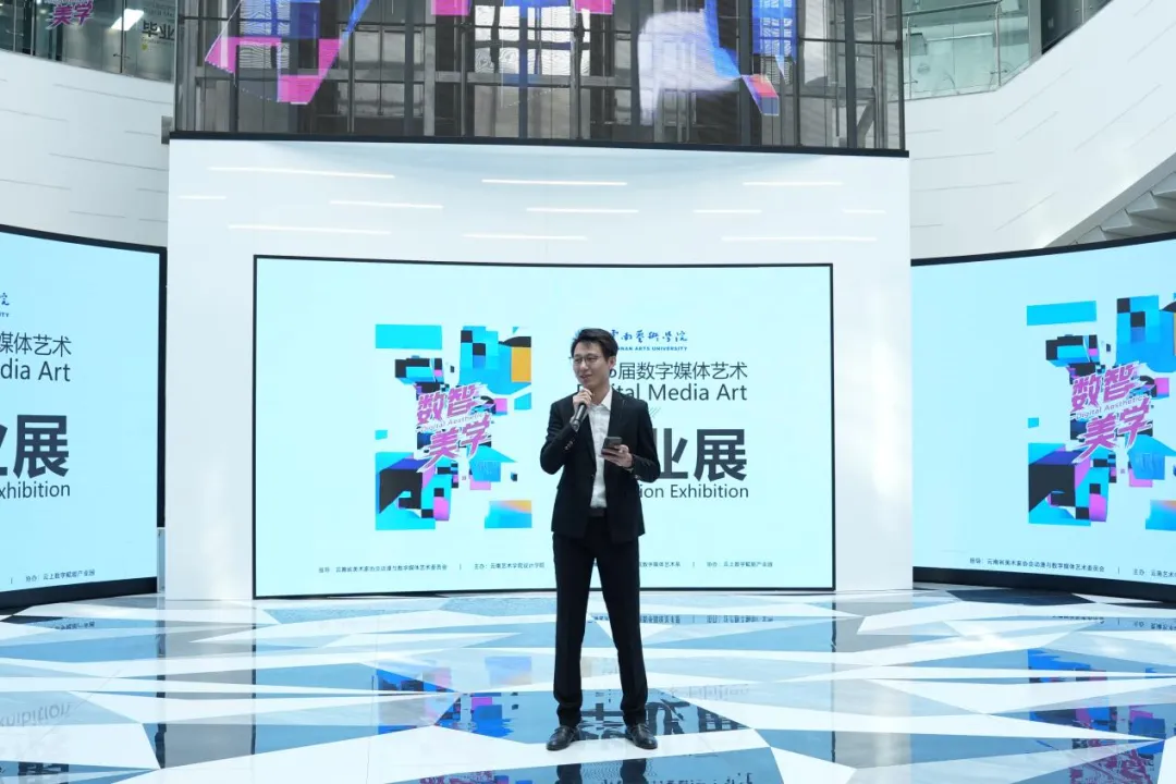 云南艺术学院党委委员、副院长蒋锋宣布开幕,并寄语毕业生。他提到“今天正值小满,在这个充满诗意的日子里,在这个弥漫数字化气息的场所,迎来了同学们的毕业展览。”他希望在场的高科技企业代表向毕业生们张开双臂,拥抱这一群新的“数字原住民”。同时,他指出在座的师生是“麦田里的守望者”,守望的是古老中华文明与最前沿现代科技之间的链接,守望的是在滚滚数码洪流时代面对高科技挑战与威胁所应有的坚守。他祝愿师生们“山高水长,数码滚烫,未来可期”!