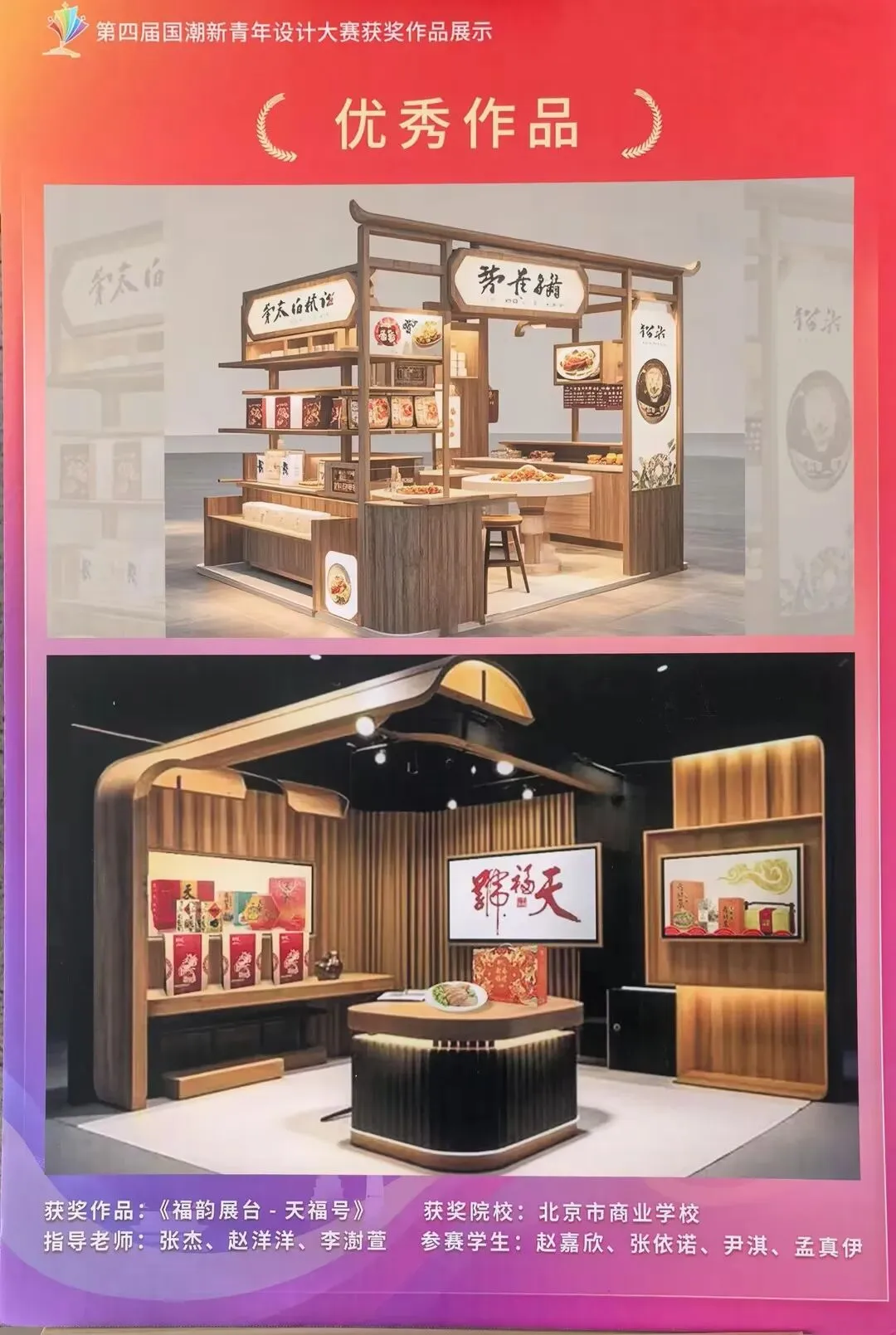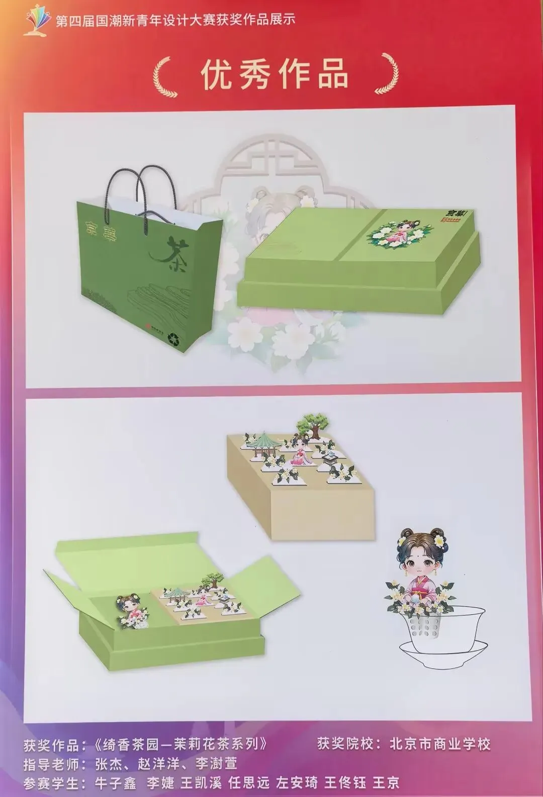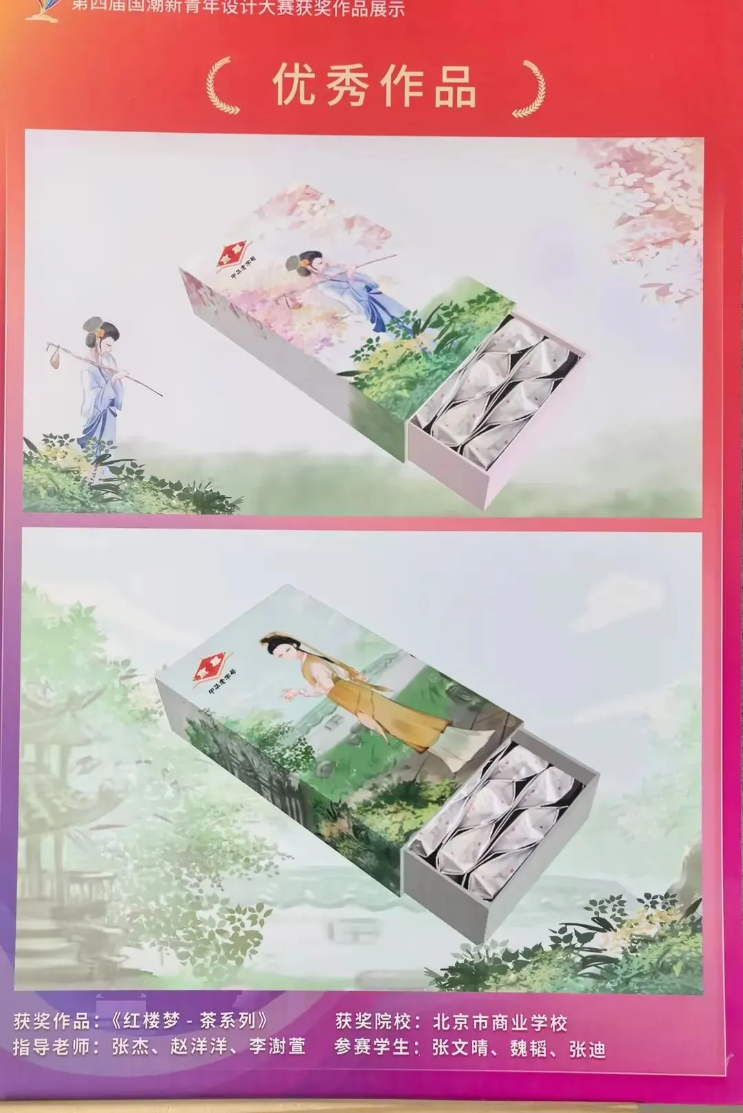 此次展览中展出了我校中职段电子商务和首饰设计专业学生的部分获奖作品:为京华茶业设计的产品包装《红楼梦-茶系列》《绮香茶园-茉莉花茶系列》、为天福号设计的营销场景《福韵展台-天福号》等。作品不仅展现了学生扎实的专业技能,更体现了他们对老字号文化内涵的当代解读与创新表达。