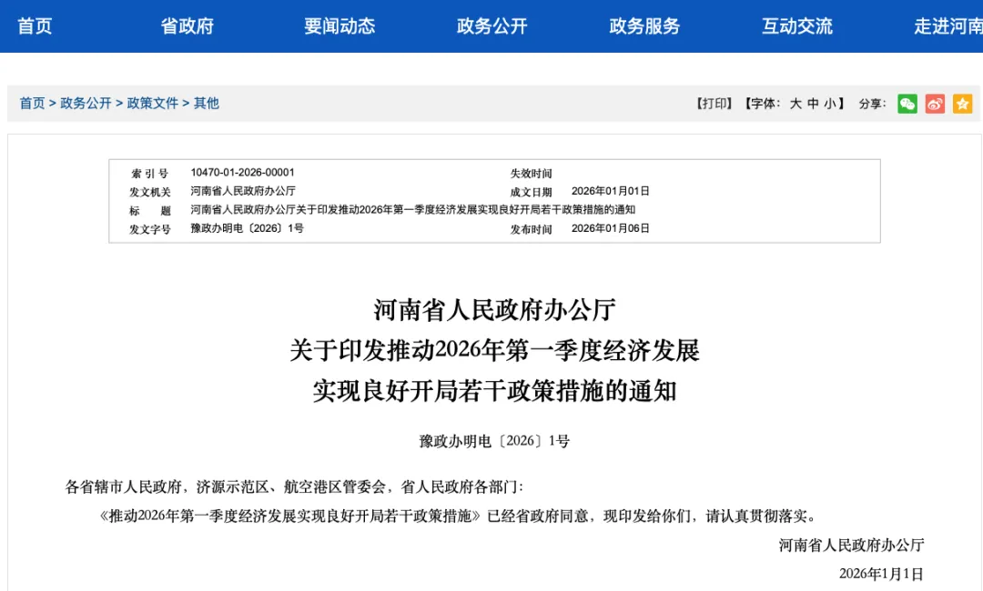 近日,河南省人民政府办公厅印发《推动2026年第一季度经济发展实现良好开局若干政策措施》,聚焦“1+2+4+N”目标任务体系,围绕融入服务全国统一大市场建设、优化营商环境、重大项目建设、促消费活动等谋划推出了一系列政策措施,推动2026年第一季度经济发展实现良好开局,为完成全年目标任务打下坚实基础。