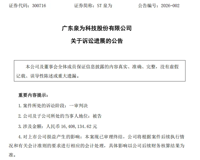 新年伊始,ST泉为(300716)就给咱们租赁同业送来了"新年第一雷"——1月6日的公告显示,苏银金租因融资租赁合同纠纷,将泉为科技及其子公司告了,涉案金额1640万元。