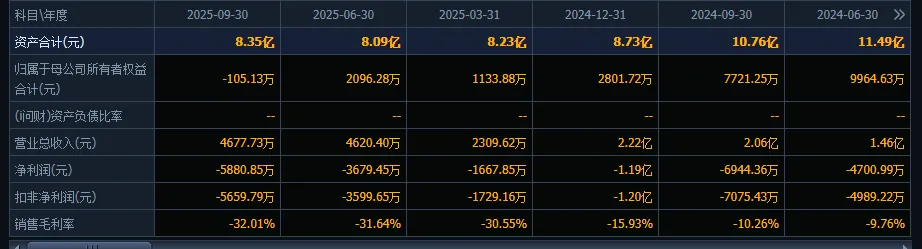看看该公司披露的2025年三季报,情况更是不容乐观:去年前三季度公司实现营业总收入4677.73万元,同比下降77.24%;归母净利润亏损5880.85万元;经营活动产生的现金流量净额为-4585.38万元。净资产为负意味着已经是资不抵债的状态,胖达判断极大可能将进入破产程序。