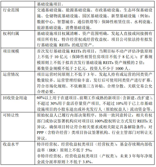 根据《国家发展改革委关于进一步做好基础设施领域不动产投资信托基金(REITs)试点工作的通知》(发改投资〔2021〕958号)、《国家发展改革委关于规范高效做好基础设施领域不动产投资信托基金(REITs)项目申报推荐工作的通知》(发改投资〔2023〕236号)(以下简称“236号文”)和交易所REITs发售业务规则,基础设施项目的准入条件整理如下: