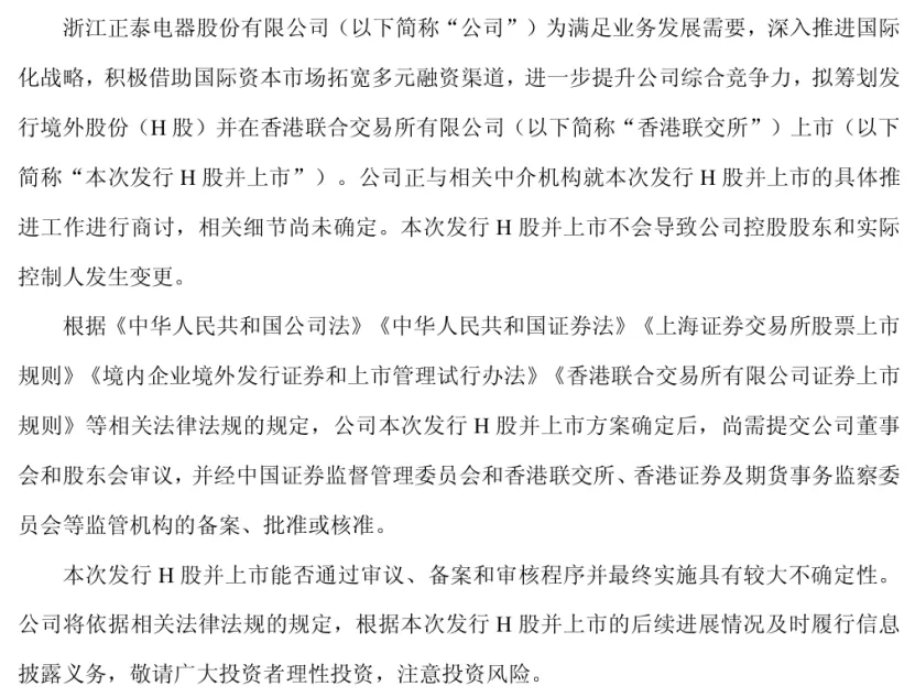 参考案例:正泰电器《关于筹划发行H股股票并在香港联合交易所有限公司上市的提示性公告》