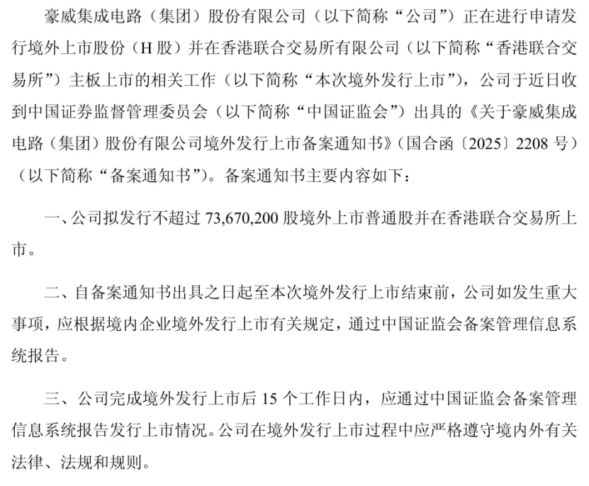 参考案例:豪威集团《关于发行境外上市股份(H股)获中国证监会备案的公告》