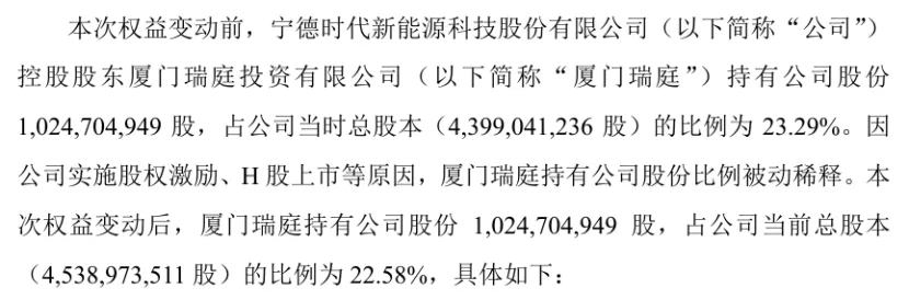 参考案例:宁德时代《关于持股5%以上股东持股比例被动稀释触及1%整数倍的公告》