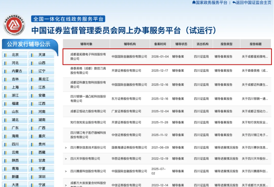 近日,成都星拓微电子科技股份有限公司(以下简称“星拓微电子”)在四川证监局完成上市辅导备案登记,全面启动A股IPO进程,辅导机构为中国国际金融股份有限公司(中金公司)。