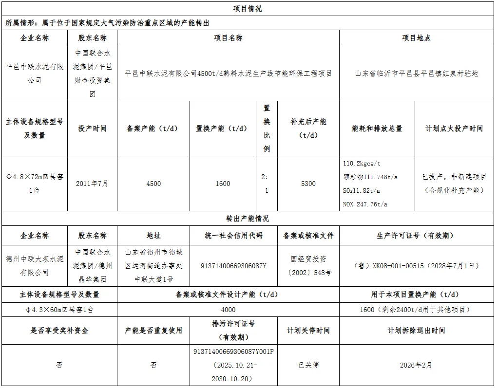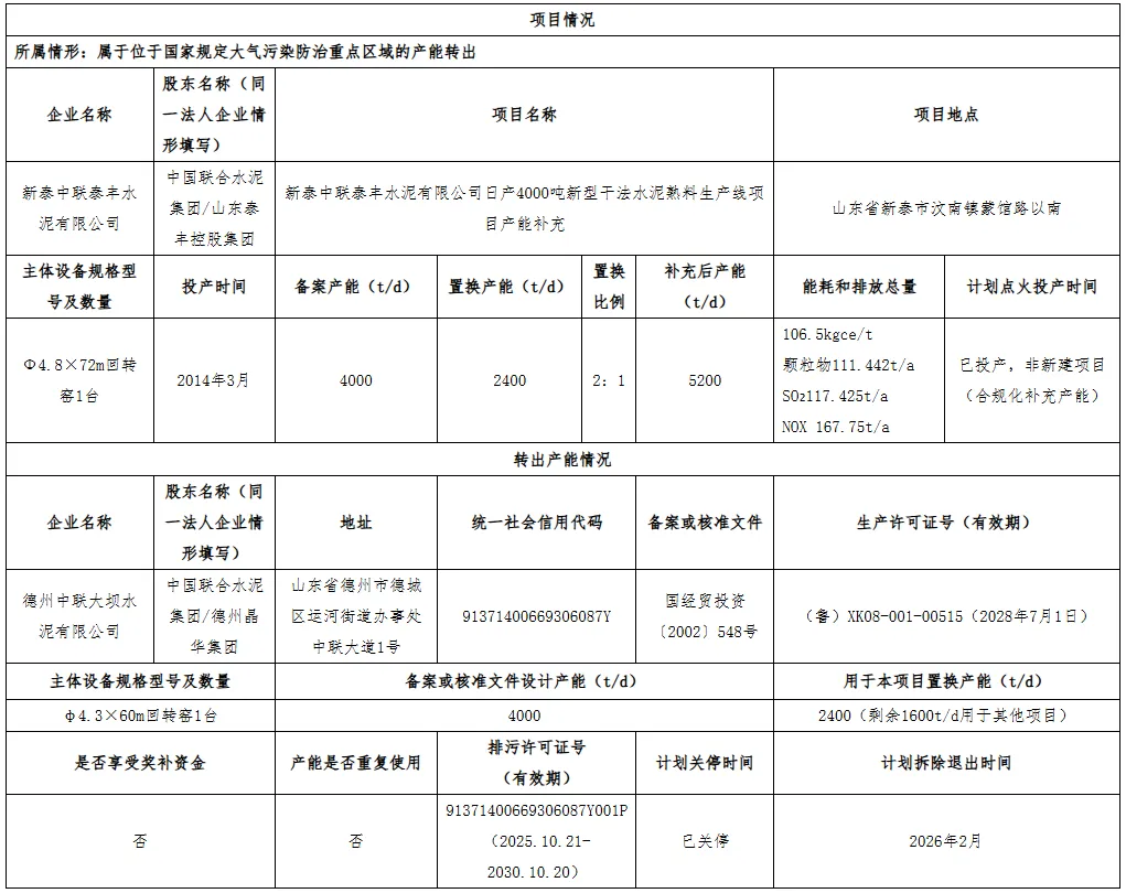 新泰中联泰丰水泥有限公司4000t/d新型干法水泥熟料生产线补充产能置换方案