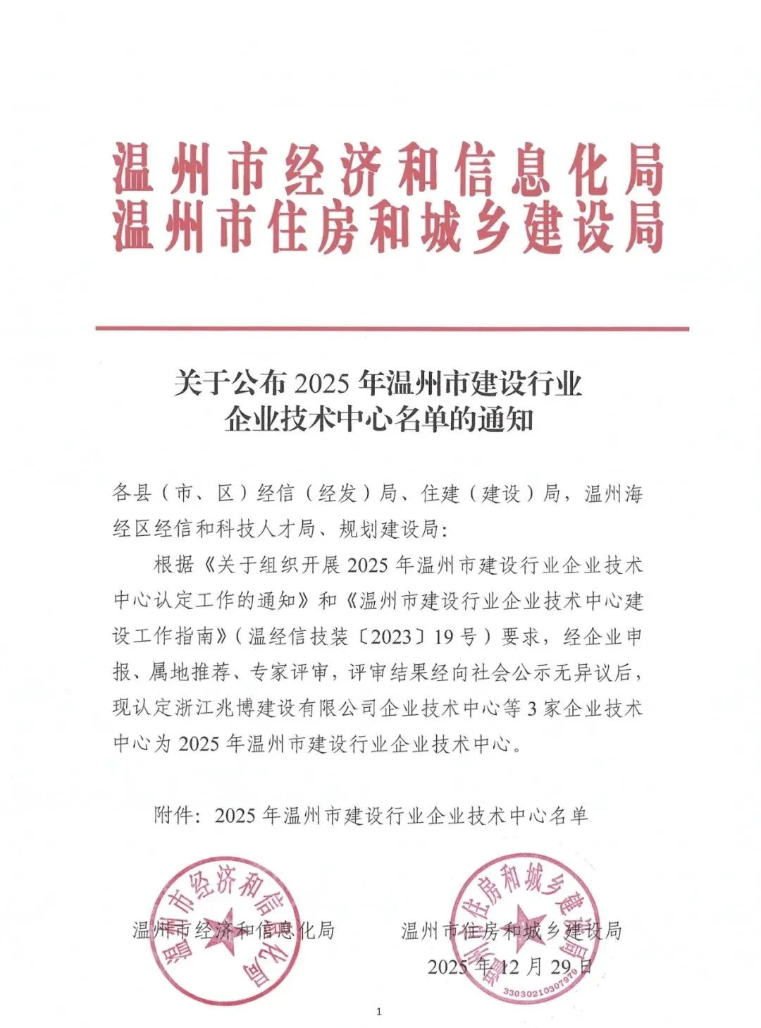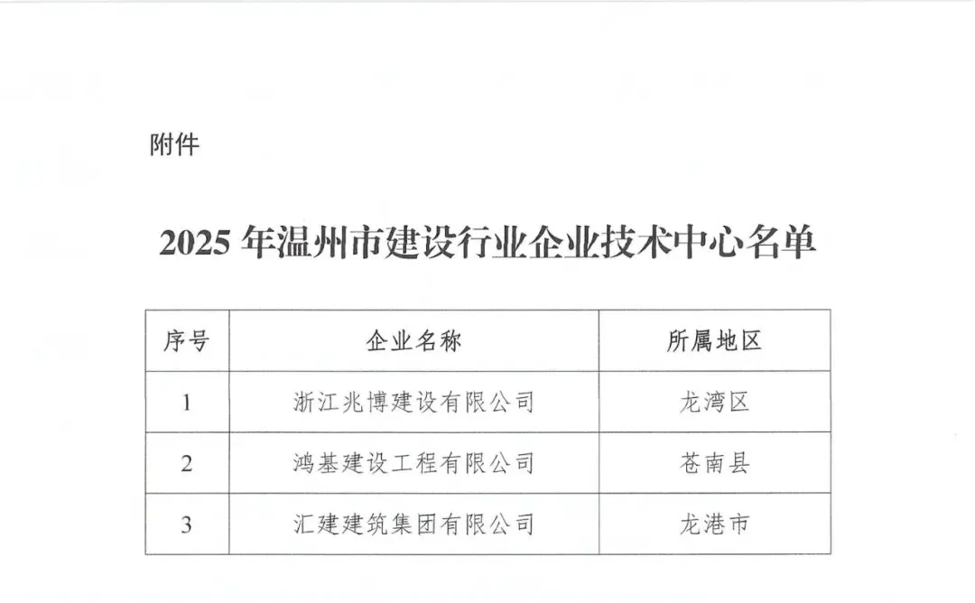 鸿基建设企业技术中心入选“温州市建设行业企业技术中心”名单