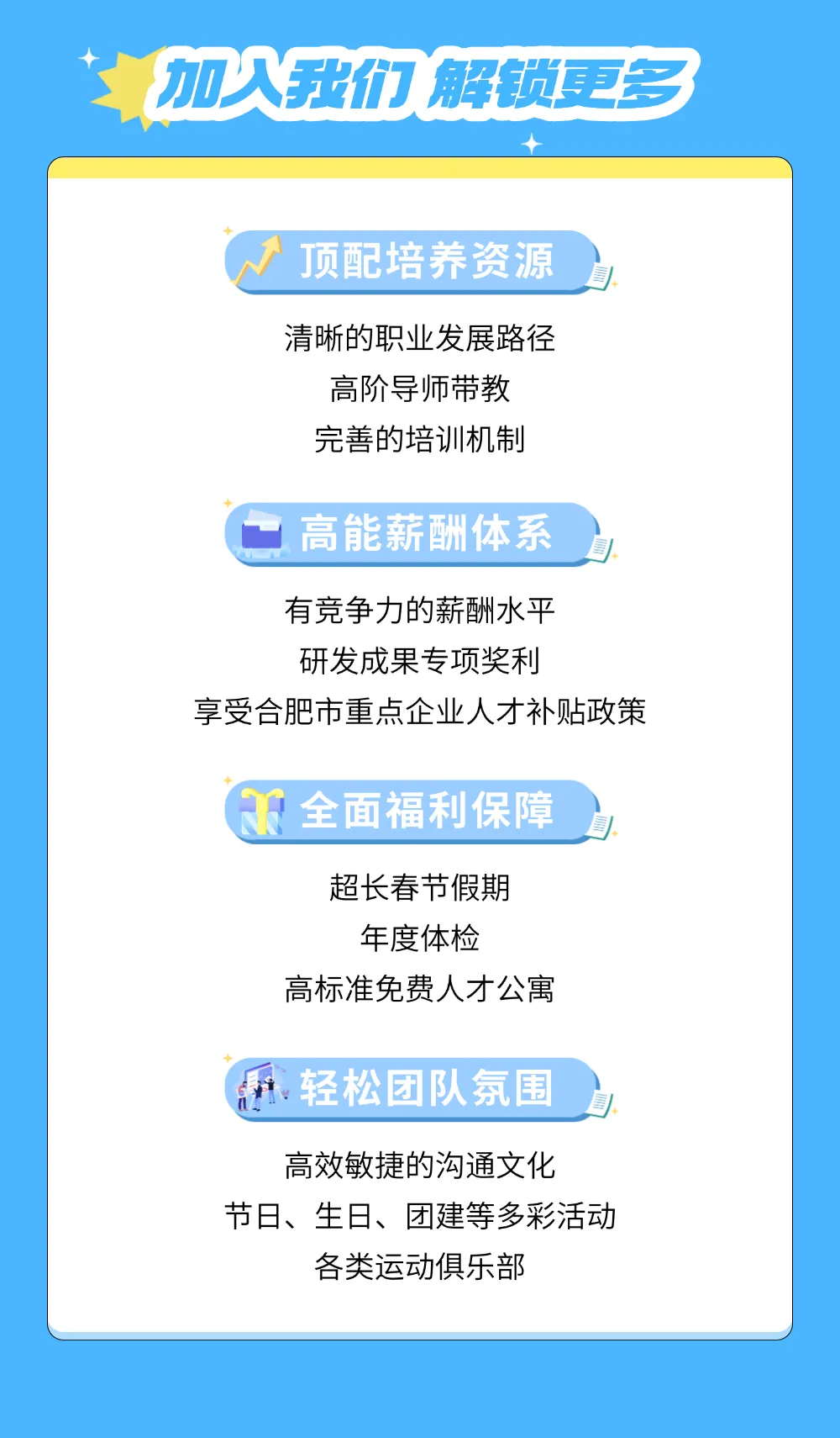 有竞争力的薪酬水平 + 研发成果专项奖励 + 合肥市重点企业人才补贴