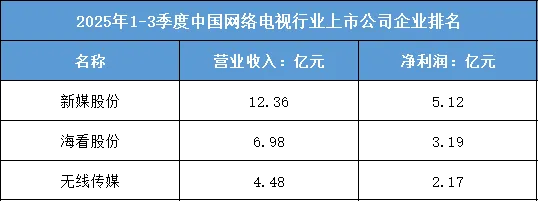 根据东财行业分类,2025年1-3季度中国网络电视行业上市公司企业排名如下:(A股上市公司)