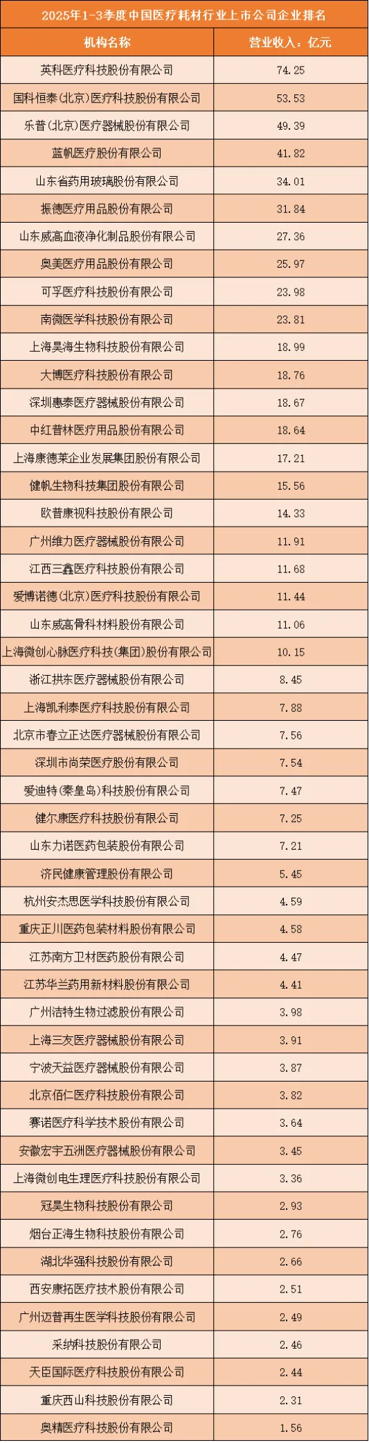 根据申万行业分类,2025年1-3季度中国医疗耗材行业上市公司按营业收入排名如下:(A股上市公司)