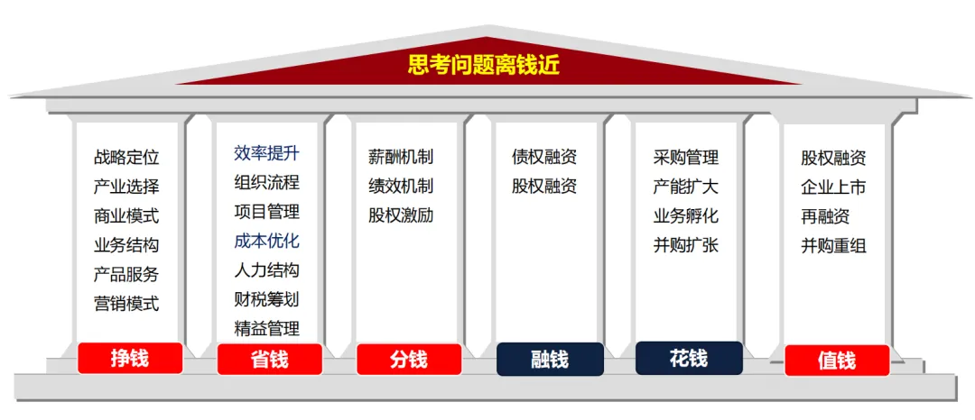 首先,第一个话题,思考问题要离钱近。这个非常关键。讨论市值战略这件事,非常重要的出发点,甚至可以说唯一的出发点就一个——公司如何更好地值钱。资本市场看一家公司是否值钱,到底看哪些维度?思考问题离钱近,企业会涉及到钱的多少个层次和维度结构?