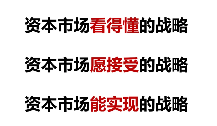 我想表达的核心是,之所以很多上市公司觉得自己很好,但是资本市场就是不感兴趣其中一个很重要的原因是,上市公司并没有客观、准确、及时地跟资本市场进行有效的沟通,资本市场对公司的投资价值、发展战略、未来前景等没有共识。上市公司是不是真的能够把公司的技术语言翻译成业务语言,把业务语言表达成财务语言,最后用业务语言和财务语言来回应资本市场,形成资本认识,非常关键。再强调一遍,用资本语言统筹总结技术语言、业务语言和财务语言,非常关键。上市公司能被资本市场看懂,是他们真金白银往前迈一步的前提。有些企业还会说,要搞神秘,越看不懂越好。大家一定注意了,资本看不懂可能就不看了。当然还会存在另外一种情况——我看懂你了,但你也不过如此,所以我就不买了。这其实就是上市公司做市值战略时,解决了能被看懂的问题后,如何赢得资本青睐的问题。这就是上市公司做市值战略定位和规划时遵循的第2句话,让资本市场接受你。看懂你,并不意味着接受你。比如说,企业选择了某条赛道,但资本市场不认为企业的商业模式更有竞争力,或者资本市场认可企业的赛道和商业模式,但不认可技术路线。能被资本市场接受,需要三个层面达成共识——资本市场怎么看我、我怎么看我以及我怎么做我。资本市场有自己的认知逻辑,企业也有自己的一套认知逻辑,我们如何有效地令企业的业务逻辑和资本市场的认知逻辑达成共识,以及达成共识的点、逻辑和自洽程度,是非常重要的。但是资本最终买的是企业的未来。上市公司战略必须能够在过程和结果上让资本市场有信心,即战略能落实能实现。能落地,意味着上市公司在战略执行过程中的一次次动作可以令资本市场增强信心、财务数据可以确认企业说过的话是可以有效实现的。动作可以一次次达成共识解决“未来”的问题。这就是上市公司做市值战略定位和规划时遵循的第3句话,战略能实现。天上飘的钱再多,5300家上市公司一分,落到个体上市公司身上的依然非常少。所以上市公司做市值战略本质上就营销企业的资本价值,即做市场,赢得资本认可、做品牌,赢得资本长期信任、做销售,资本真金白银买公司股票。四、一个 模型,探讨上市公司高质量发展,从业绩增长到价值增长