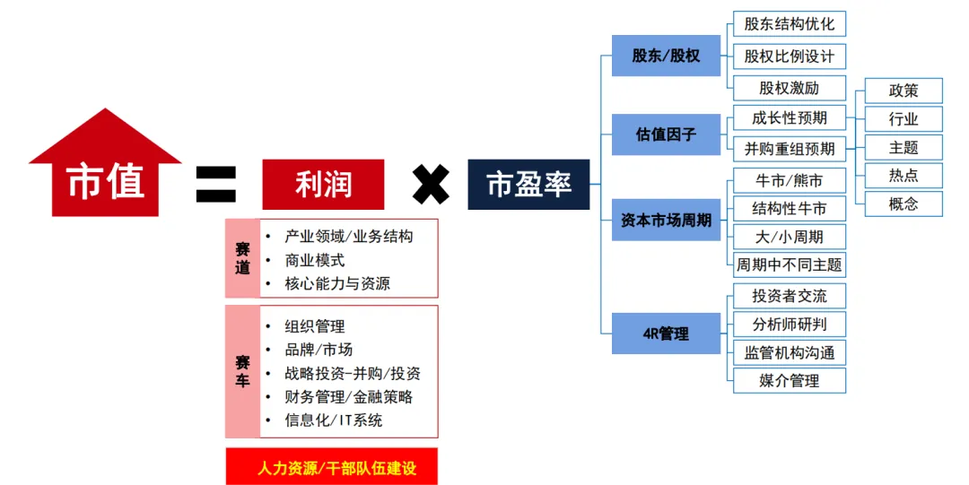 我用这个公式探讨上市公司市值管理:市值=利润×市盈率。当然还有一个公式:市值=股价×股本数,这个公式啥意思?做市值管理就是操纵股价、做市值管理就是调股本。用这个公式推动市值,上市公司就会剑走偏锋。这特别不好,我建议是回归到“市值=利润×市盈率”这个体系中来。根据“市值=利润×市盈率”这个公式看,上市公司提高市值的方法可以是:1、市盈率不变的情况下,壮大净利润;2、净利润不变的情况下,提高市盈率的估值倍数;3、既做利润扩大,也做倍数提高。下面我们展开说一下。净利润从哪里来?我认为一种是挣出来的,一种是省出来的。这就又回归到了思考问题离钱近了。在挣钱的维度上至少包括三个层面:1、行业不一样,上市公司所处的行业利润水平就不一样;2、在行业中所处的位置不一样,上市公司的利润水平也不一样;3、行业一样、行业位置一样、产品也一样,但商业模式不同,企业挣的利润点数空间有差异(个性化定制PK标准化产品大规模生产驱动销售)。赛道选择利润有差异、赛道中的环节位置选择利润有差异、赛道环节中的商业模式构建利润有差异,是不是也就直接决定了公司的净利润的来源是不一样的。其实在公司做出选择的那一刹那基本就决定了能挣多少钱了。这也是为什么用结构的思维看公司的增长性,比看供研产销更重要些。另外,做完选择,想挣钱就必须进行市场突围,势必要考虑产品的竞争性、技术含量、成本优势进而精细化管理。所以说,挣钱一部分、省钱一部分,支撑了公司的净利润来源。资本市场会看得到公司挣钱的方式、未来的增长空间、发展前景在什么位置,再结合对行业时间窗口、业绩的拐点的预判,从而决定了它愿意给企业的忍耐(等待)时间。这就是上市公司提高市值时对净利润的考虑。在思考提高市盈率倍数时,也有很多要素。第一个,股东或者说股本结构、股权比例。先说股东或者说股本结构。上市公式来回调整实际控制人、公司治理也不规范,大家是不是对你就没信心,不愿意给你一个稳定的、高估值的状态。股东结构里到底有谁(比如是汇金、平准基金或者是国家队的社保基金)、流通股股东结构里谁当你股东,无形中对公司的资本价值会产生差异。国家队的钱成为公司流通股东中的权重股东,大家会说这家上市公司大概率是一个国家队看好的优质白马股,长期稳健、持续经营、回报可预期;如果说流通股股东结构里出现了知名基金管理人,大家会认为这家上市公司是明星基金股,可能会有爆发性,也可能会有倍数级增长;但流通股股东结构里出现了杭州滨江大道某证券公司营业厅涨停敢死队的几个席位,大家会怎么看这家公司呢?大家会觉得你是个妖股,还是远离吧。上市公司进行资本价值管理,思考市盈率问题时非常重要的是要考虑优化流通股股东结构。这也是为什么在个别省份的国资委考核国有上市公司市值管理过程中有个指标是流通股股东结构中机构持仓比例,再细的话要看具体是什么机构、持仓的比例、时长。这种考核如果成为趋势,董办的压力就更大一点了。当然,在原始股东或实控人这个层面上调股东结构,在一定程度上也会引起资本市场对这家公司新的战略定位、新的发展方向、新的成长逻辑的期待。除了股东/股本结构还要看股权比例。当股权比例多与少直接决定了公司话语权时,其实反映的是股东的战略意图,通过股权比例和公司治理席位,落实到公司的经营管理体系上。当然还有一个就是股权激励。上市公司有没有推股权激励,直接决定了某一类钱对这家公司的期待值和认可度不一样。资本市场上就有一种投资力量喜欢看:第一这家上市公司的中高层团队都持有股权激励;第二目前的股价表现已经跌破了股权激励的成本价。大家会想,公司的中高层一定会要认真努力改善公司业绩,让股价重新回归到合理的位置。既然他们会更努力,我们(资本)就搭个便车。这类资本称之为金融行为学。这看的就是利益的共同体是打在了相向而行还是相悖而行的过程中。第二个,成长模式。成长模式跟商业模式直接相关,公司靠自然增长还是靠外延扩张,这直接决定了公司的成长速度和节奏完全不一样。用三年、并购的手段,快速壮大到百亿级销售规模,还是用三年、滚动增长,做到30亿的销售规模,资本市场对此的期待值肯定是不一样的。这就是资本市场对成长性的预期会因为成长的策略和路径不同而存在差异。第三个,公司是否善用产业周期、资本周期的利好。换句话说,公司能否对冲周期。像煤炭,是特别典型的周期性行业,尤其是动力煤。这类上市公司挖出来的煤就是卖给火力发电厂,存在非常典型的周期波动。煤炭价格低,火力发电厂的利润水平就高。大家就会“冬炒煤夏炒电”这么玩。怎么去对冲这个周期波动呢?,如果你单纯只是挖煤企业,行业产能严重过剩时,煤卖不出去,你再怎么加大力度做客户关系、再怎么加大销售力度,这其实都是在做运营层面的改善。但你是不是可以调动一部分资金直接收购一些火力发电厂,直接用资本的纽带解决公司业务上的对冲关系。企业控股了很多火力发电资产后,当煤炭价格低,但我火力资产的利润就高;当煤炭价格高,我火力资产利润水平会低一些,但并表加在一起,总盘子还是非常合理的。这是一个非常典型的、用产业链延伸手段对冲周期波动