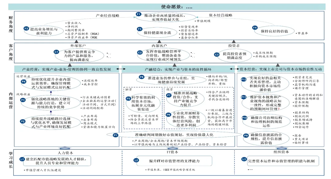 市值战略是个名词,围绕市值价值合理最大化,统领公司的经营、管理和资本运作;市值战略是种思维方式,站在公司更值钱的角度,考虑业务发展和经营动作,看挣钱、省钱的感觉就不太一样了。把值钱的维度,在资本市场拉高,统领企业各项经营;市值战略是一组动作,一组机构化、系统化的动作,它有内在的逻辑自洽,它是一套有组织、成体系的主动管理动作。所以思考上市公司市值战略,没办法头痛医痛脚痛医脚。但也不是说所有的上市公司做市值战略都需要从头到尾地把整个体系做一遍。有的企业业务战略做的已经非常扎实了,它就不需要做业务战略,只需要资本战略上做调整(比如资本价值传播和认可度上做的不够,就针对性提高);也有可能是传播动作做的很好,但公司自己提炼的投资亮点和资本市场认可的投资亮点有差异;有的是产业本身的确是不行了,导致公司需要做些调整。以上就是我对市值战略的认识、提炼的方法论以及实践中的一些体会和感受,希望对大家有启发。