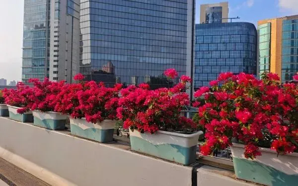 延安高架、南北高架、内环高架构成的 “申字形” 高架,早已化作 “空中花廊”。经过多年选育,月季和三角梅成为常固定“主角”。每年7月至11月,浦西高架大部分路段会换上三角梅,搭配亮金女贞、六道木交替摆放,打造出富有层次感的空中景观。