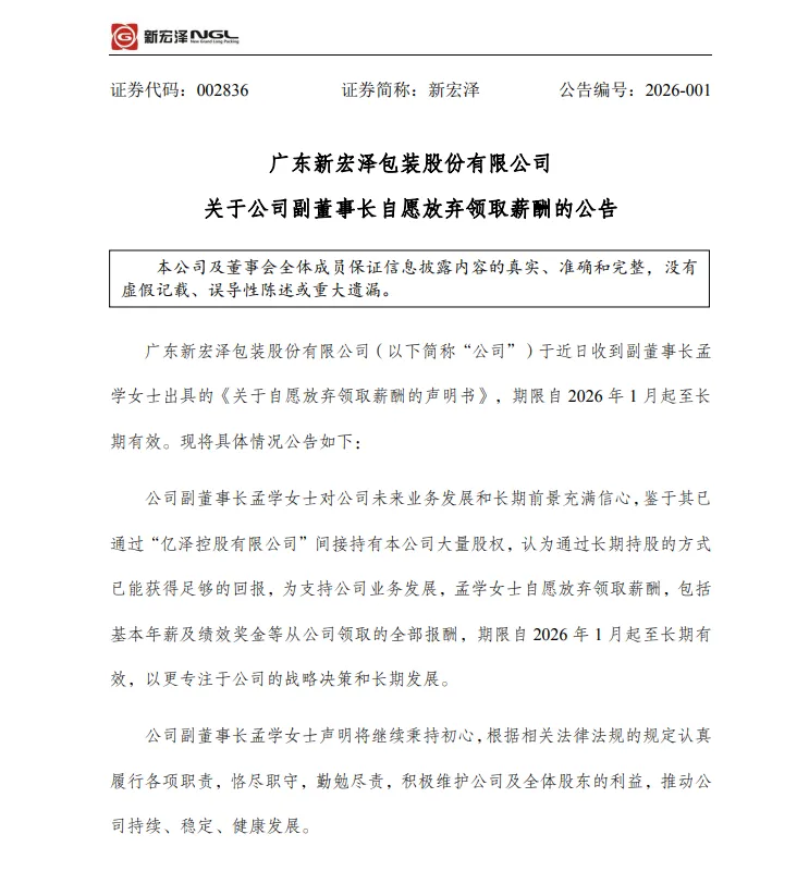 1月7日,上市公司新宏泽发布公告称,公司副董事长孟学对公司未来业务发展和长期前景充满信心,鉴于其已通过“亿泽控股有限公司”间接持有本公司大量股权,认为通过长期持股的方式已能获得足够的回报,为支持公司业务发展,孟学自愿放弃领取薪酬,包括基本年薪及绩效奖金等从公司领取的全部报酬,期限自2026年1月起至长期有效,以更专注于公司的战略决策和长期发展。