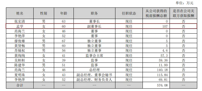 2024年年报显示,孟学1965年出生,澳大利亚南澳大学工商管理硕士,2011年至今一直担任公司董事,现任公司副董事长,年薪为107万元。