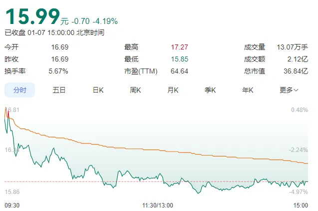 截至1月7日,新宏泽收报15.99元/股,跌4.19%,总市值36.84亿元。