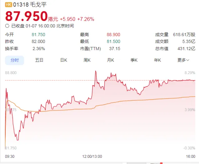 此外,公告提到,这次主要通过“大宗交易”方式减持。这意味着股份大概率会转手给机构投资者,而不是直接在二级市场抛售,这在一定程度上保护了股价,避免引起恐慌性下跌。1月7日,毛戈平的股价收87.95港元/股,上涨幅度达到7.26%,总市值为431.12亿港元。