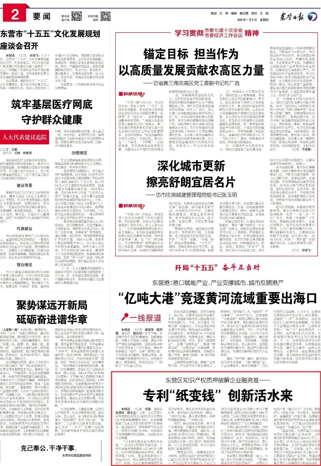 一筹莫展之际,一场精准走访带来转机。东营区知识产权保护服务中心副主任信欣在“知识产权惠企走访”中,得知企业的专利储备后,主动上门指导企业筛选出16项核心专利开展质押融资,最终成功获得银行1000万元授信。“以前主要把专利看作技术实力的证明,没想到关键时刻,成了盘活资金的‘硬通货’。”王忠伟感慨道。