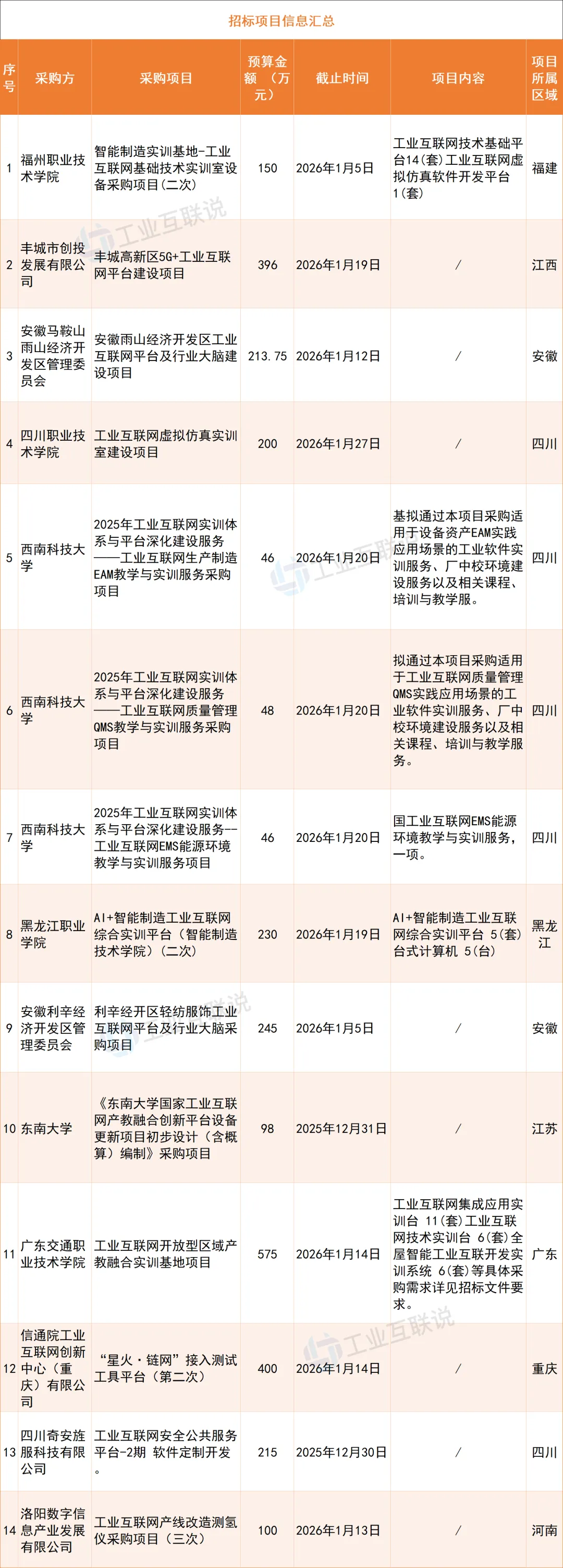 看看近一周(12月20日~12月30日)工业互联网招标项目情况,据不完全统计,本次整理到14个项目。预算2962.75万元。(仅整理公布具体金额的项目)。四川省以5个项目领先,占总项目数的 35.7%,显示该地区在相关领域的投资活跃度较高。分散分布:其余8个地区(安徽、广东、江苏、江西、河南、福建、重庆、黑龙江)各仅有1-2个项目,分布相对分散。单项目高投入:广东省虽然仅有1个项目,但预算金额高达575万元,是所有项目中单个预算最高的地区。均衡投入地区:安徽省有2个项目,总预算458.75万元,单个项目平均预算229.38万元,投入相对均衡。为方便大家及时拿到行业资料,工业互联说现在推出[升级版]服务,扫码加入[[XG云数智·知识岛]获取最工业互联说、5G、元宇宙、数字化资料!↓