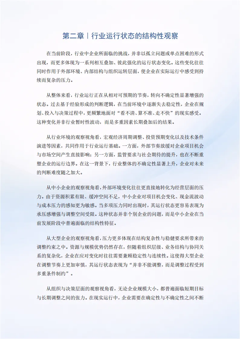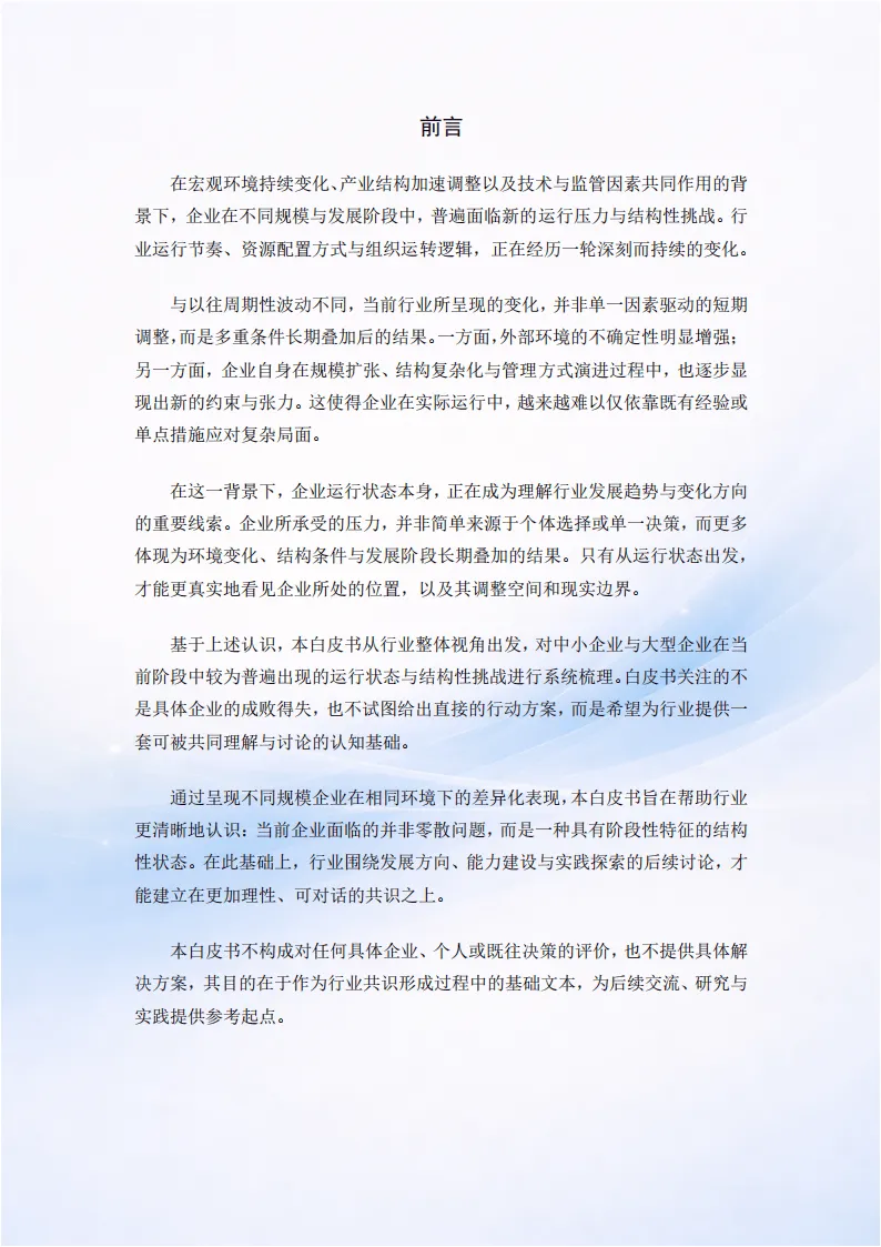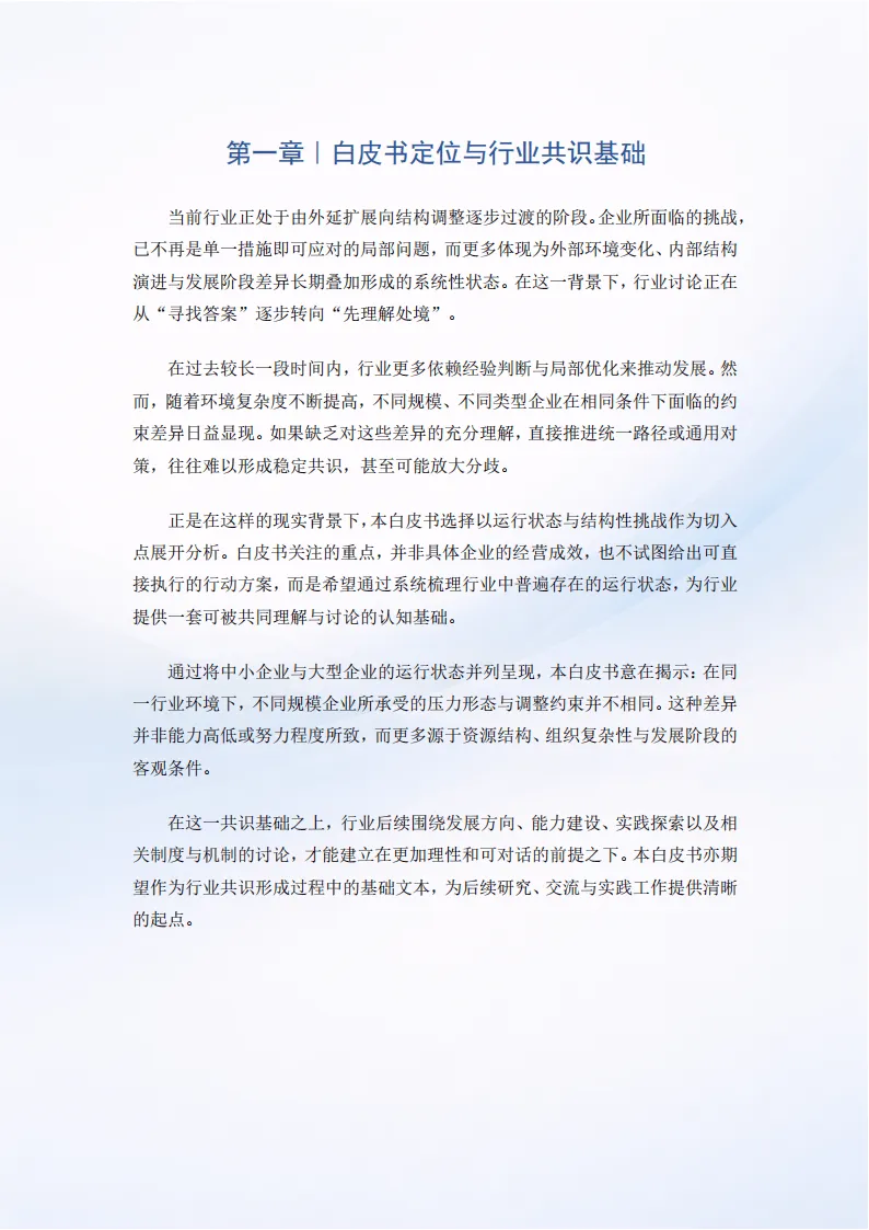 白皮书强调,不同规模企业的压力差异源于资源结构、组织复杂性与发展阶段的客观条件,而非能力或努力程度。行业当前的核心命题已从“快速增长”转向“复杂条件下的稳健运行与持续演进”。建立对行业处境的共同理解,是后续开展发展方向、能力建设等相关讨论的前提。该白皮书作为行业共识形成的基础文本,为各类市场参与方提供了认知起点,助力行业在理性对话中探索发展路径。