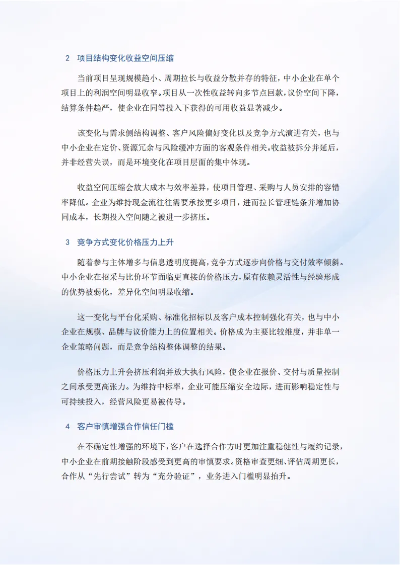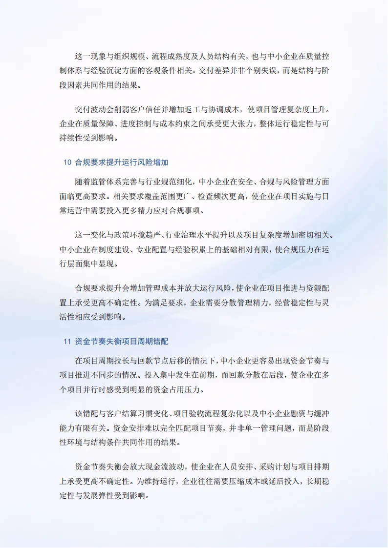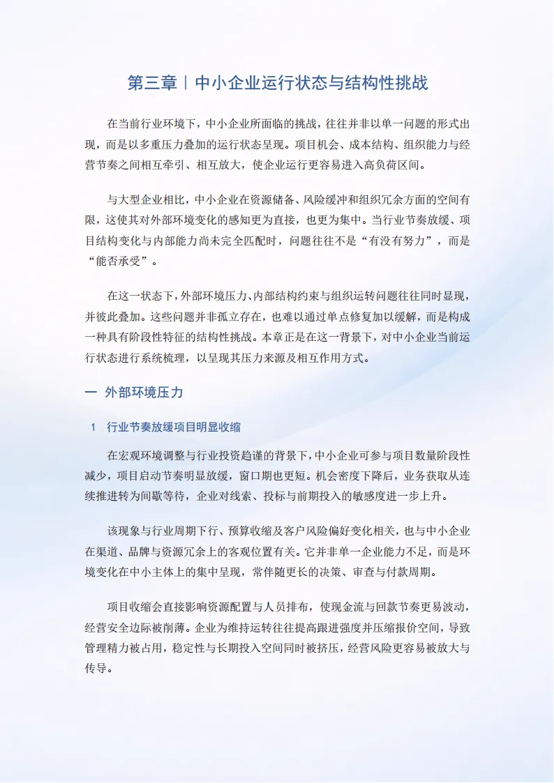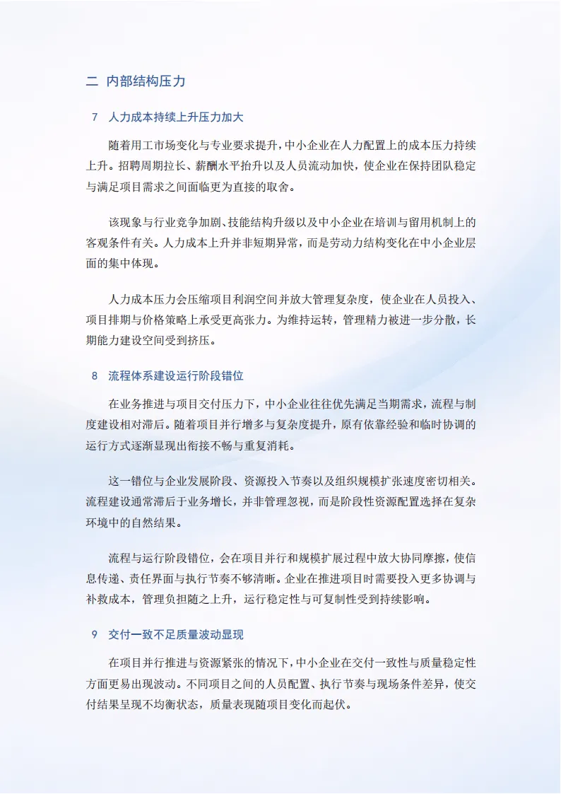 中小企业的压力集中体现为多重叠加的运行困境。外部环境方面,行业节奏放缓导致项目收缩,项目结构变化压缩收益空间,价格竞争加剧与客户信任门槛抬升进一步挤压生存空间。内部结构上,人力成本上升、流程建设滞后、交付质量波动、合规压力增大、资金节奏失衡等问题交织,管理层精力被分散,长期投入受限。组织运转层面,决策依赖个人经验、试错空间狭小、执行机制不稳定,发展转型中经验路径适配不足、转型路径模糊,使企业陷入高负荷运行状态。