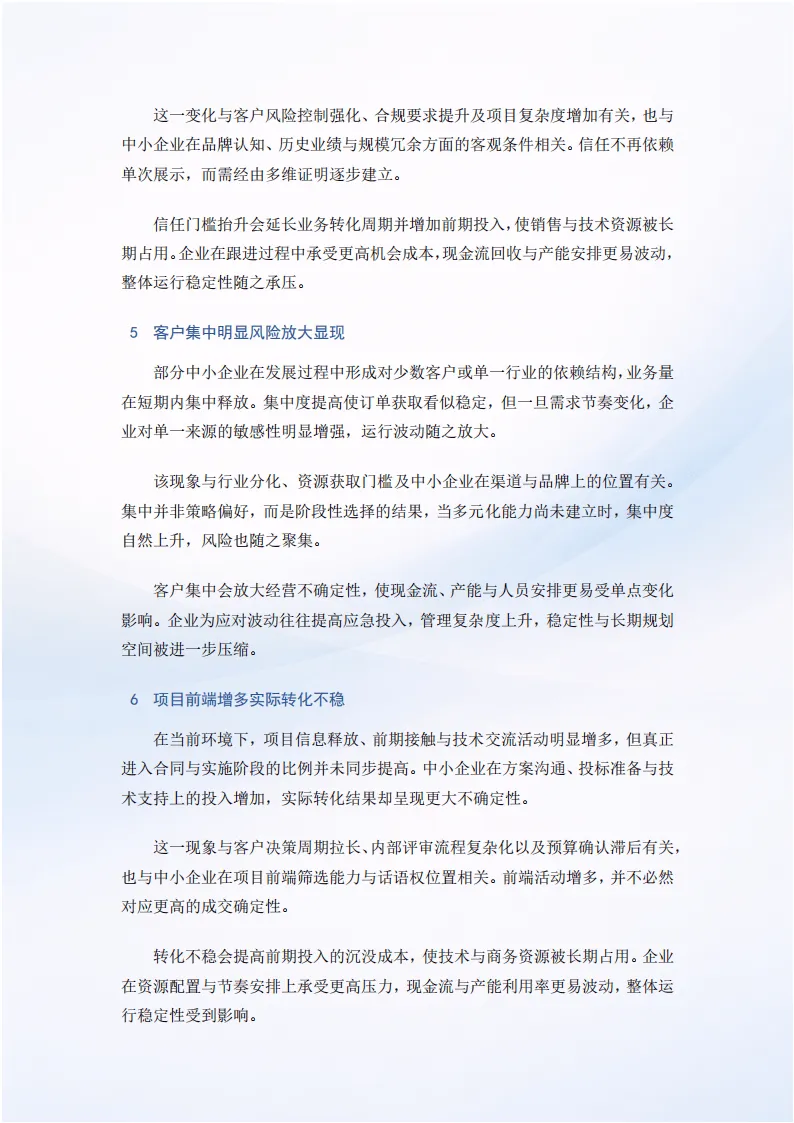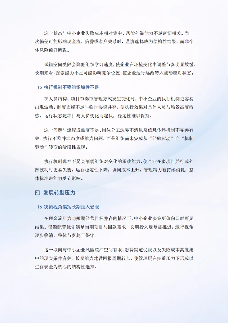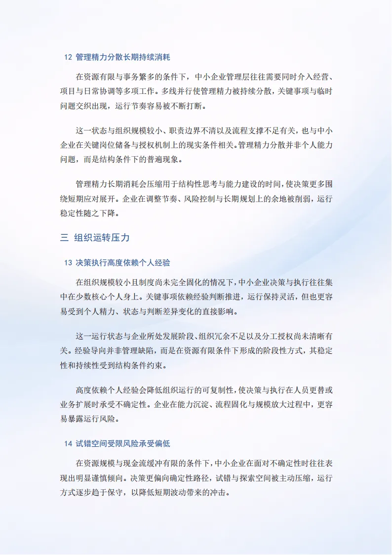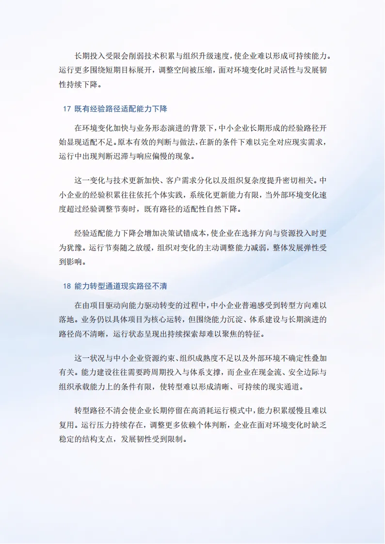 中小企业的压力集中体现为多重叠加的运行困境。外部环境方面,行业节奏放缓导致项目收缩,项目结构变化压缩收益空间,价格竞争加剧与客户信任门槛抬升进一步挤压生存空间。内部结构上,人力成本上升、流程建设滞后、交付质量波动、合规压力增大、资金节奏失衡等问题交织,管理层精力被分散,长期投入受限。组织运转层面,决策依赖个人经验、试错空间狭小、执行机制不稳定,发展转型中经验路径适配不足、转型路径模糊,使企业陷入高负荷运行状态。