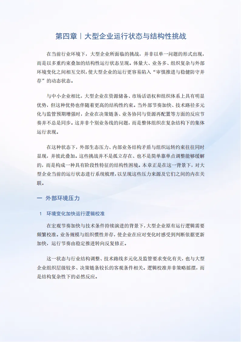 大型企业则受制于结构复杂性与稳健性要求。外部环境中,技术模式重构冲击既有优势,监管与社会关注增强,风险事件外溢效应放大,行业路径选择复杂度上升。内部结构面临多元业务协同困难、历史资产形成路径惯性、客户结构调整周期长、数据整合能力不足、资源配置目标张力等问题,组织结构调整成本高昂。组织运转上,层级增多导致流程复杂,跨部门协同成本高,多重绩效目标难以平衡。发展转型中,短期业绩压力挤压转型空间,战略转化受结构约束,多方利益协调使转向节奏审慎。