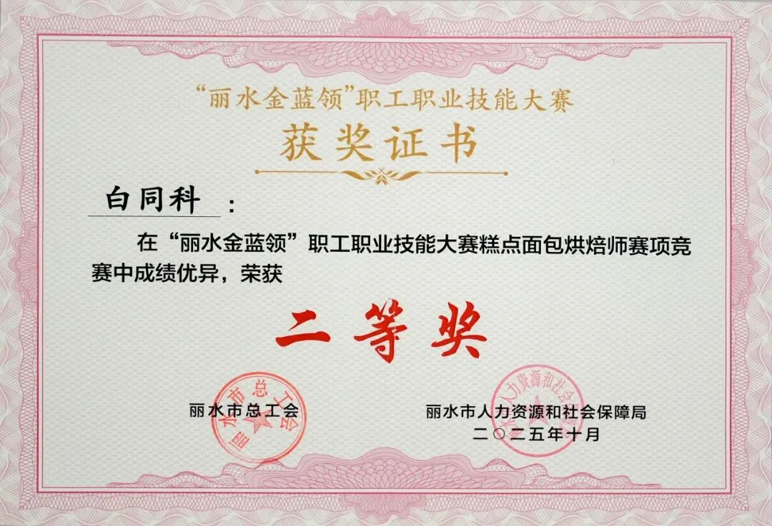 会展公司烘焙师白同科在“丽水金蓝领”职工职业技能大赛糕点面包烘焙师赛项中脱颖而出,荣获二等奖,并作为优秀技能人才代表登台接受表彰。