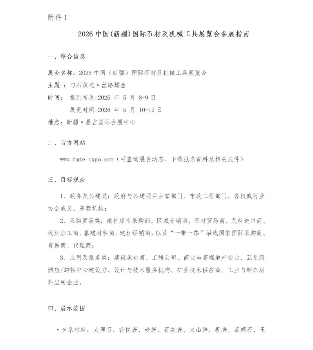 为深入贯彻落实国家推动西部地区高质量发展及促进制造业转型升级的战略部署,精准把握石材产业绿色化、高端化、智能化发展趋势,助力行业企业抢占西部及中亚市场新机遇,加强产业链上下游资源对接与交流合作,经研究决定,中国石材协会将作为“2026中国(新疆)国际石材及机械工具展览会”指导单位,邀请会员及相关企业参加本次展览会。该展会由东都国际展览(北京)有限公司、沃泽源展览(上海)有限公司联合承办,展览时间为2026年5月10日—12日,地点设于新疆·昌吉国际会展中心。展会期间,拟将同步举办“中国西部(‘丝路’)石材产业发展研讨会”,聚焦产业发展痛点难点,共商合作发展路径(研讨会具体安排另文通知)。