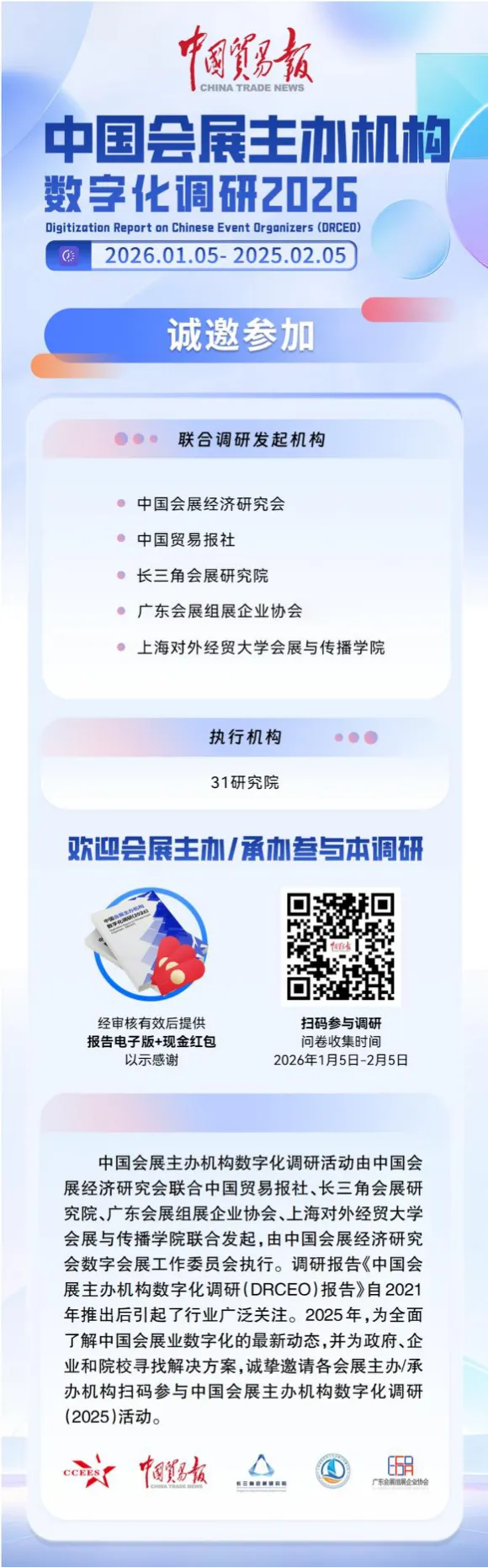 1月5日,由中国会展经济研究会联合中国贸易报社、长三角会展研究院、广东会展组展企业协会以及上海对外经贸大学会展与传播学院共同发起的“中国会展主办机构数字化调研(2026)”正式启动,现面向全国会展活动主办机构发出诚挚邀约,期待您的深度参与,共话行业数字化转型新路径。