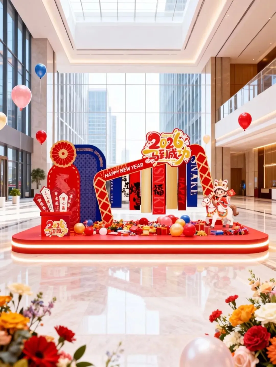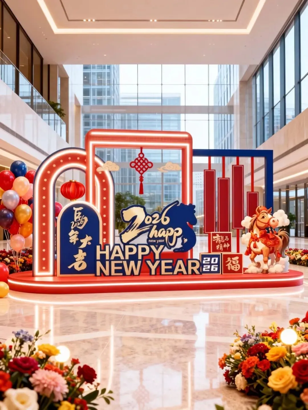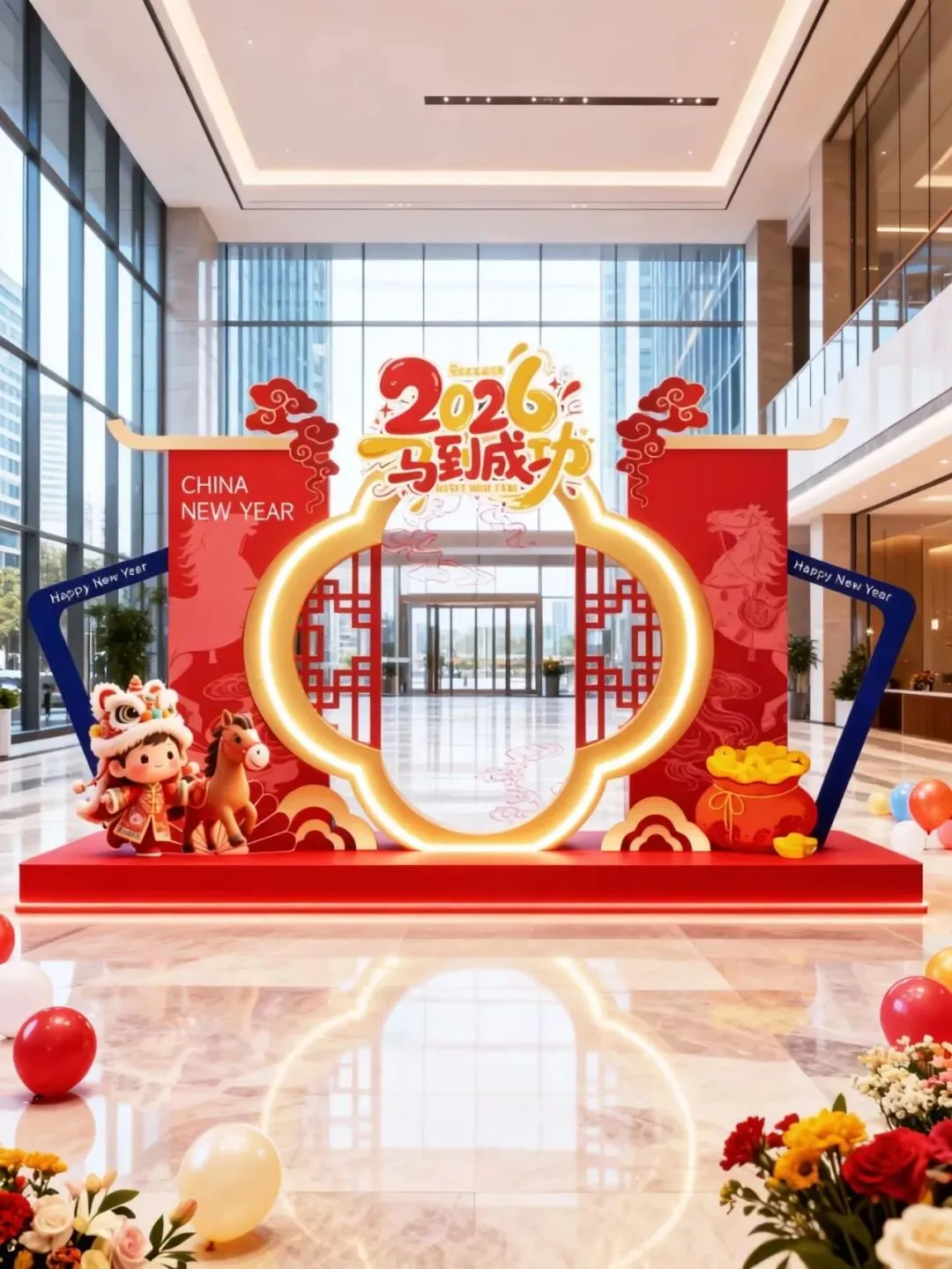 年底的年会、展会想自带吸睛 buff?别再用千篇一律的背景板啦!像图里这种融合生肖元素 + 国潮设计的定制美陈,把 “马年大吉” 的喜庆和现代感狠狠拿捏 —— 发光拱门、萌趣生肖装置一摆,不仅是打卡点,更是品牌氛围的加分项~