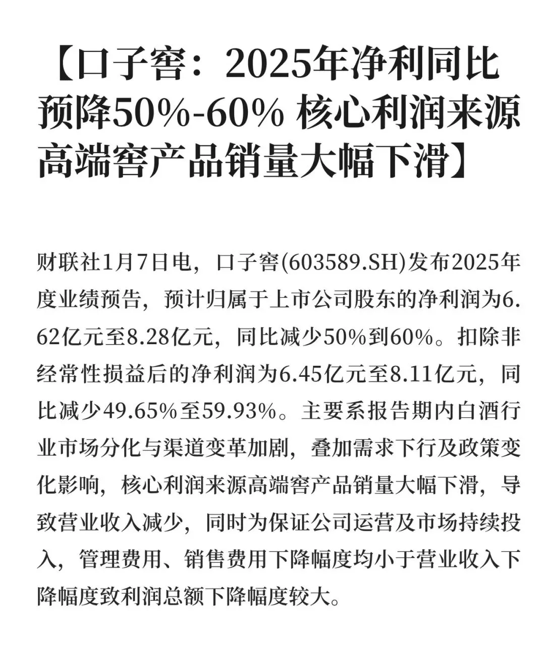 2026年1月7日,口子窖发布了2025年业绩预减公告,预计净利润同比减少50%到60%。这是公司自2015年上市以来最严重的业绩下滑,而就在第三季度,公司单季净利润更是暴跌92.55%。