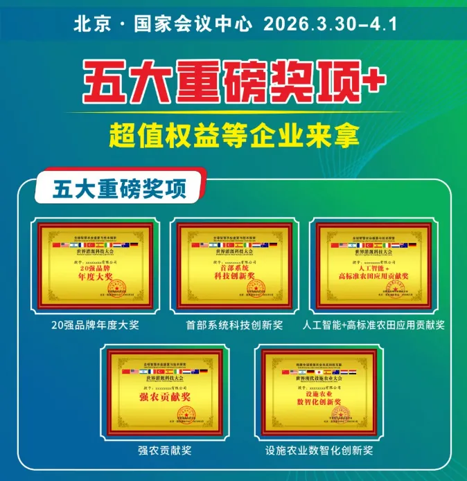 5大奖项既是行业顶尖认可,更能直接链接海外采购商、政府项目方资源,以奖项背书引爆全球曝光,让企业品牌站上国际农业舞台 C 位。