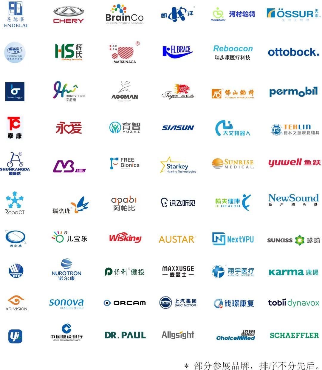 包括凯洋、互邦、威之群、大洋、顺康达、博动、松永、东方等助行移动辅具厂商;奥托博克、奥索、瑞哈、环球精博、中站康豪、精博现代、丹阳假肢等假肢、矫形器生产装配企业;康辉、赐和、慈济、大艾、中兴、新松、泰亿格、儿宝乐、亦欢、达那福、环宇呈现等康复品牌;肇观、荣光美沃、Dot Incorporation、索诺瓦、爱听、新声、七鑫易维等视听沟通辅具企业。