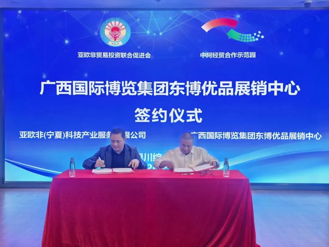 在银川综合保税区管委会副主任吕文亮及各方嘉宾的共同见证下,中阿经贸合作示范园董事长苏军平与南宁国际会展中心有限公司总经理、中国东盟优品展销中心负责人区晓文代表双方正式签署《战略合作框架协议》。