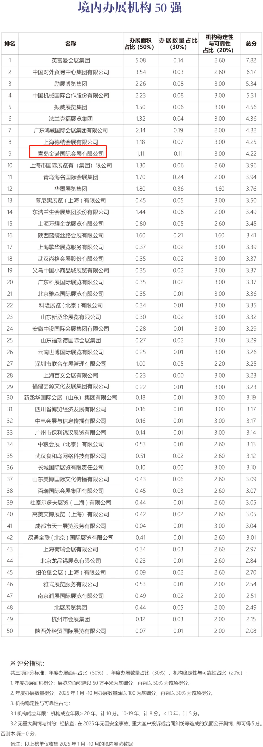 近日,会展业年度榜单《中外会展品牌排行榜》重磅揭晓。该榜单覆盖会展业全产业链,涵盖机构类、项目类、目的地类、场地类等多个核心类别,其中《境内办展机构 50 强》分榜单同步揭晓——青岛金诺国际会展有限公司凭借稳健的综合表现与突出的行业竞争力强势突围,荣登第9名,成功跻身境内办展机构前10强,以专业实力与行业价值获得权威认可,充分彰显了金诺会展在会展领域的扎实根基与优质口碑。