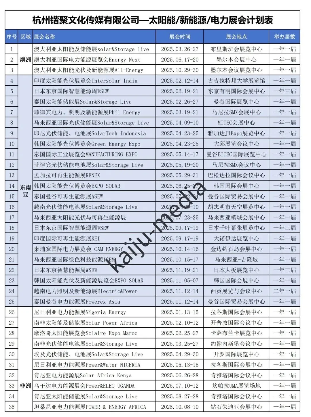 锴聚传媒专注国际会展行业十年,从事于会议、展览、活动策划、品牌建设与海外推广一站式服务。截止今日已服务超1500家中小企业,为中国出口企业提供展位预定、展台搭建、展前推广一站式参展服务,我们承接代理来自欧洲、中东、非洲、美洲、澳洲、亚洲等地区专业的太阳能及新能源国际展览会。公司以客户为中心,以市场为导向,一直致力于以国际化的专业水准和与时俱进的创新理念服务于外贸企业!