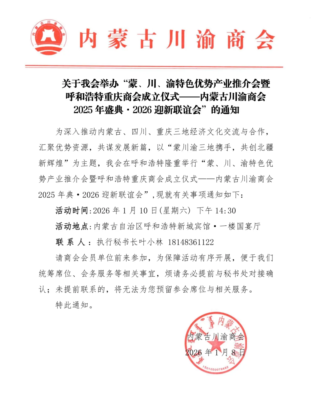 关于我会举办“蒙、川、渝特色优势产业推介会暨呼和浩特重庆商会成立仪式——内蒙古川渝商会2025年盛典·2026迎新联谊会”的通知