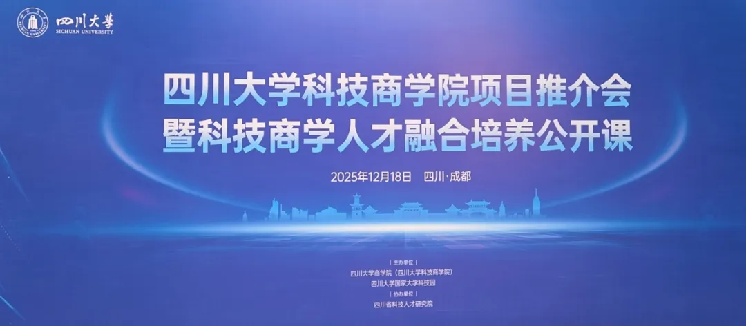 12月18日,由四川大学商学院(四川大学科技商学院)、四川大学科技园主办,四川省科技人才研究院协办的四川大学科技商学院项目推介会暨科技商学人才融合培养公开课在四川大学国家双创示范基地顺利举行。中国科学院院士、四川大学生物治疗全国重点实验室主任魏于全,四川省科学技术厅厅长路松明,四川大学常务副校长褚良银等嘉宾出席活动。