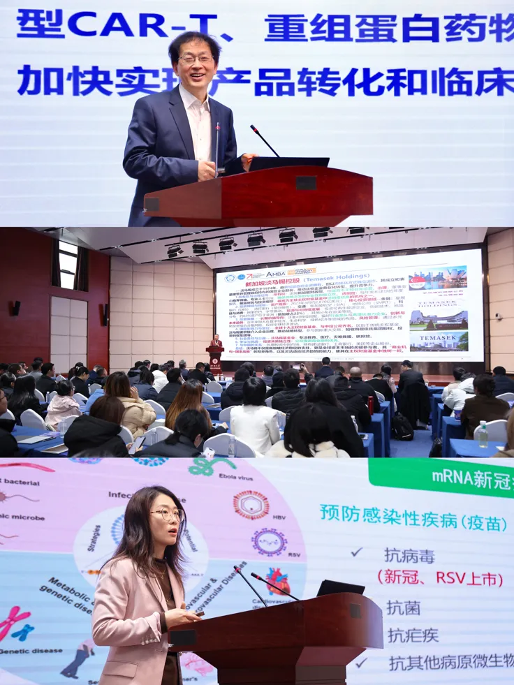 在主题报告环节,中国科学院院士魏于全、中国科学技术大学科技商学院教授吴林分别围绕“生物治疗平台与成果转化”“AI时代科技与资本协同创新”作专题分享。四川大学生物治疗全国重点实验室宋相容教授则以mRNA纳米药物为例,展示了科研成果从实验室走向市场的创业实践。