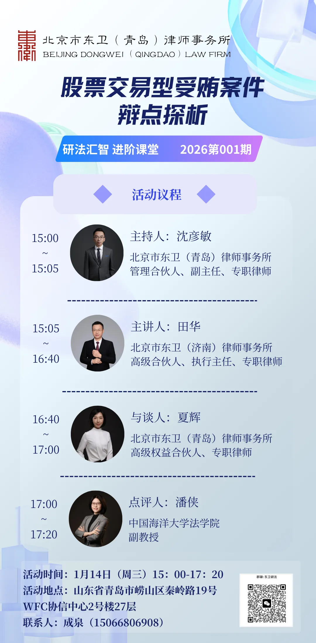 为深入探讨该类案件的辩护要点与实务难点,提升律师在新型经济犯罪领域的办案能力,北京市东卫(青岛)律师事务所邀请北京市东卫(济南)律师事务所高级合伙人、执行主任田华律师做“股票交易型受贿案件辩点探析”专题分享。本次活动属于“研法汇智 进阶课堂”系列2026年首期,旨在搭建专业交流平台,通过对典型案例的剖析与辩点梳理,助力律师在复杂案件中实现有效辩护,共同推动法治实践与理论研究的深度融合。