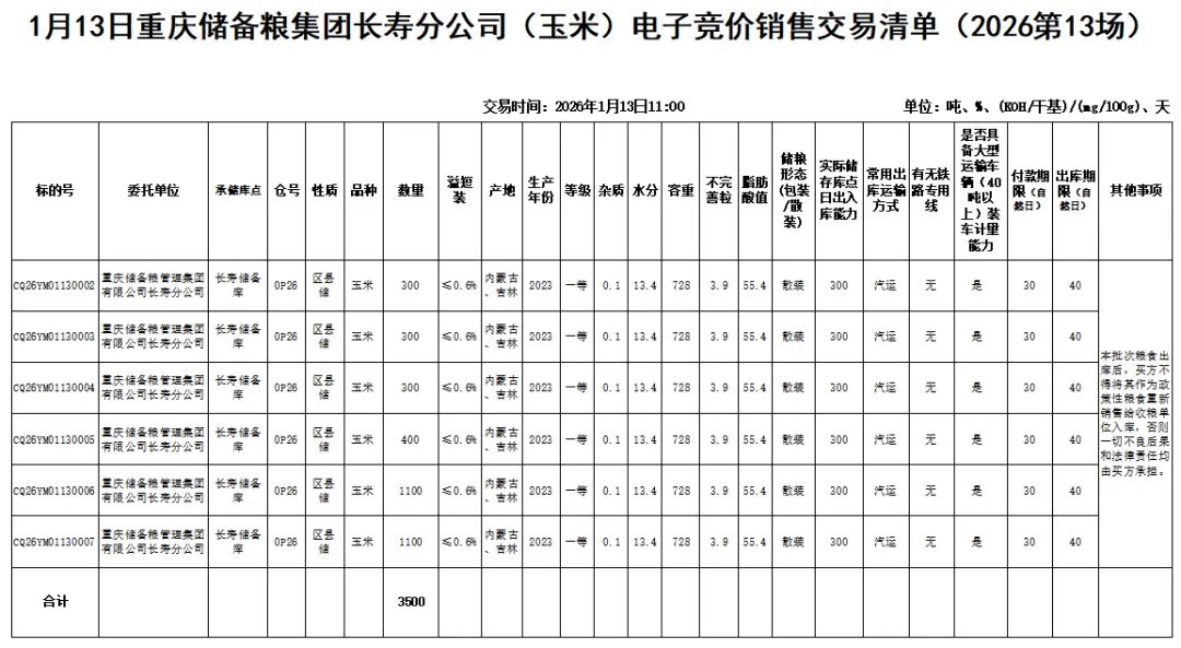 受重庆储备粮管理集团有限公司长寿分公司委托,重庆市粮油批发市场有限责任公司(即国家粮食重庆交易中心,以下简称“批发市场公司”),定于2026年1月13日11:00举办重庆储备粮集团长寿分公司(玉米)电子竞价销售交易会,现将有关事项公告如下: